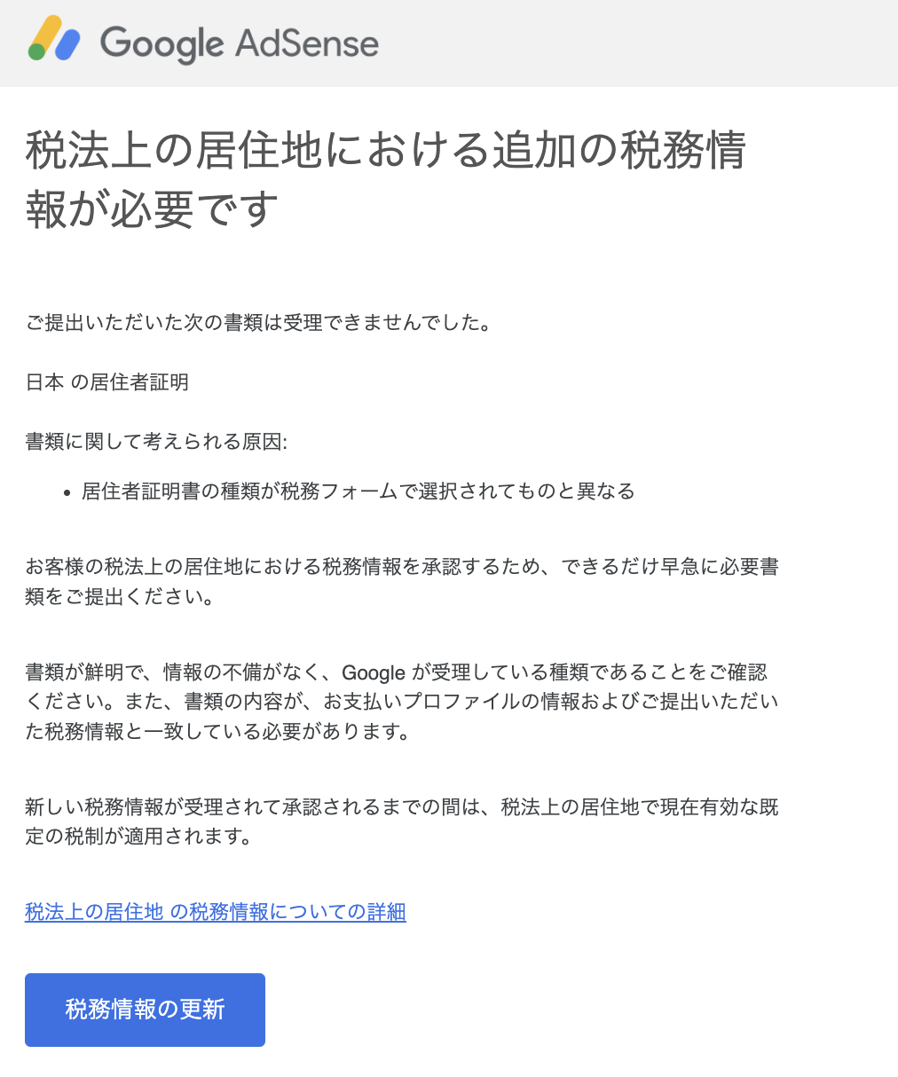 「税法上の居住地における追加の税務情報が必要です」というメール