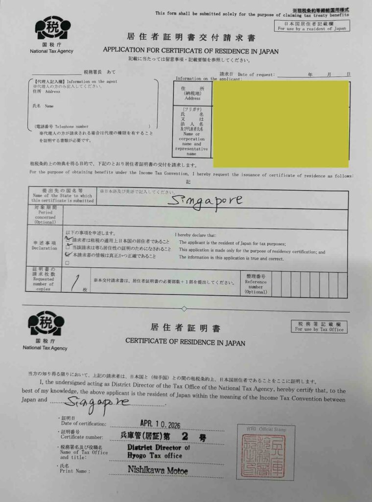 【解決法】新しいフォームから「税法上の居住地の証明書」で再申請